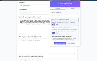 Applying Assistant is a Chrome extension designed to enhance the job application process by providing job seekers with pre-written templates for common questions. This tool allows users to create and store custom responses that can be quickly inserted into application forms, significantly reducing the time spent on repetitive tasks. With its smart field detection feature, the extension automatically recognizes relevant text fields on job application pages, enabling one-click autofill of information.